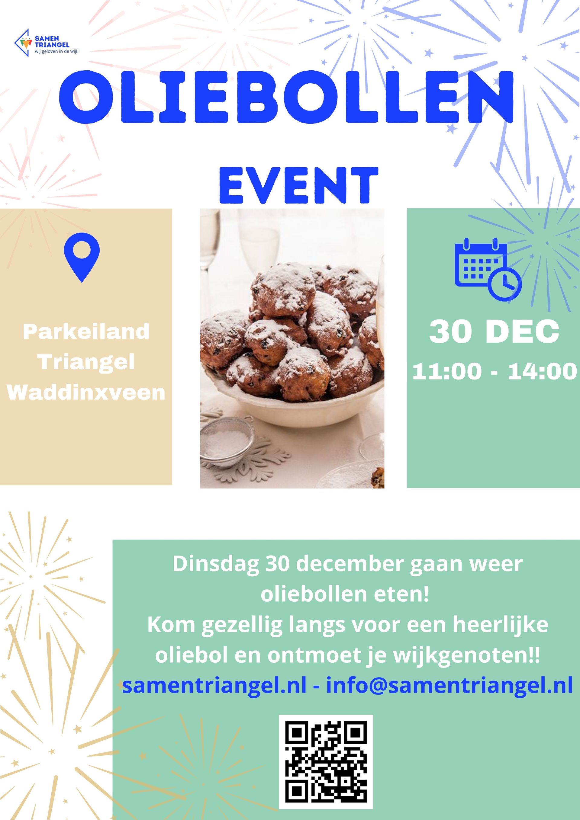 Samen Triangel organiseert voor alle wijkbewoners dit oliebollenevent. Loop gezellig langs voor een gratis oliebol en een lekker bakkie koffie of chocolademelk! Een mooie manier om het jaar af te sluiten samen met andere wijkbewoners!